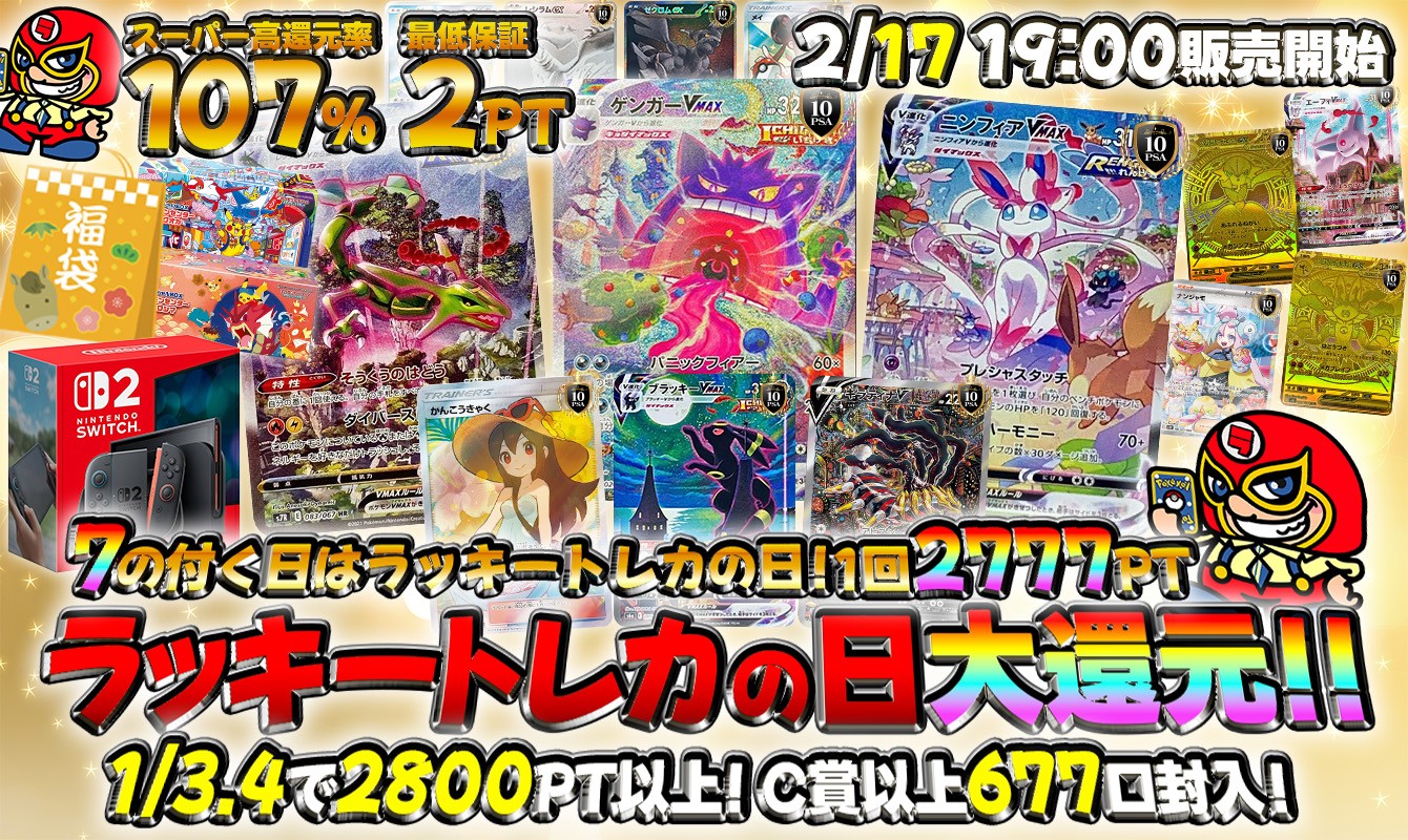 業界最高値級買取価格! ラッキートレカでは買取に超絶本気で取り組んでいます!! 【🔥業界最高値級買取価格宣言🔥】 重要なのでもう一度、、 【🔥業界最高値級買取価格宣言🔥】 PSA、素体、サプライ、 ポケカ関連なんでも買取致します!! さらに今なら買取金額をラッキートレカ内で使用できるポイントに 変えると買取価格を20%UP⚡ この機会に是非買取お待ちしております💨💨